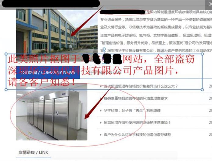 深圳市華宇現(xiàn)代科技有限公司擁有一項(xiàng)恒溫恒濕存儲(chǔ)柜國(guó)家發(fā)明專利,和多項(xiàng)相關(guān)的結(jié)構(gòu)新型及軟著專利。產(chǎn)品廣泛用于外資企業(yè),大企業(yè),企業(yè)集團(tuán),軍工,醫(yī)藥,博物館,檔案館。最近發(fā)現(xiàn)市面有很多貿(mào)易公司或五金生產(chǎn)廠家,在線下或網(wǎng)絡(luò)上盜用我司的產(chǎn)品資料及圖片進(jìn)行不良銷售活動(dòng)。更有甚者以華宇現(xiàn)代的品牌私下接單,但實(shí)際銷售的產(chǎn)品卻是不具備恒溫恒濕功能的非我司產(chǎn)品!(例如和深圳市華宇現(xiàn)代科技有限公司相似名稱來(lái)取名以混淆客戶,更有甚者,其網(wǎng)上全部圖片盜用華宇現(xiàn)代產(chǎn)品圖片,以蒙騙客戶(可以進(jìn)入華宇現(xiàn)代官網(wǎng)www.lzhxjiancai.com比較即知))